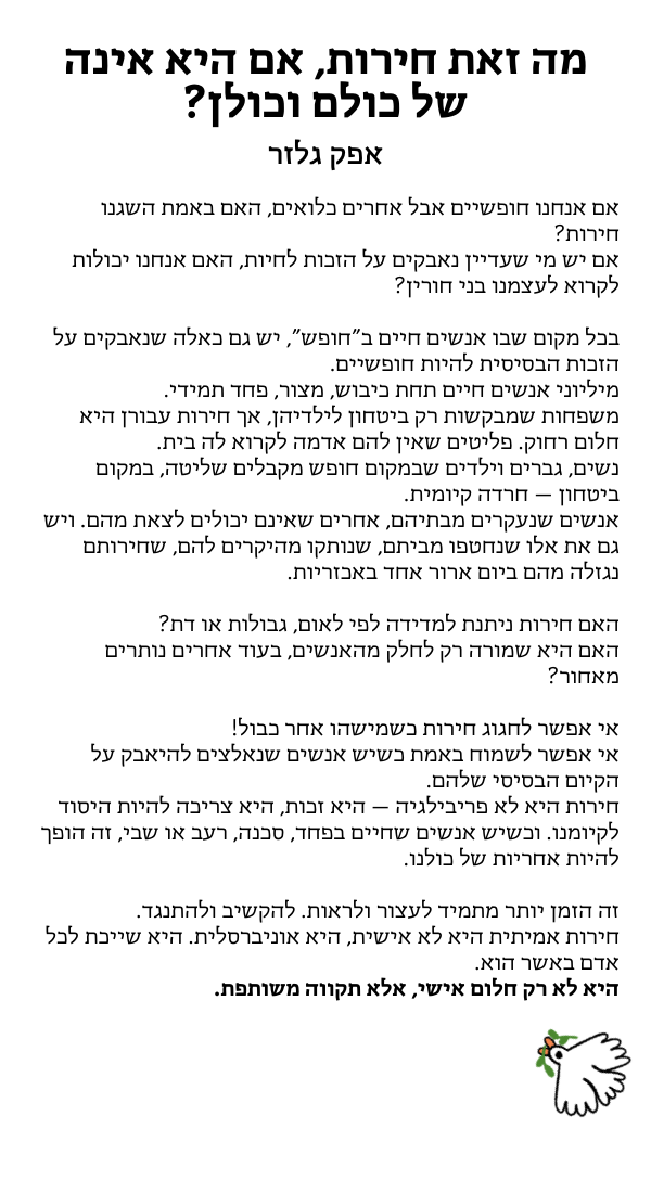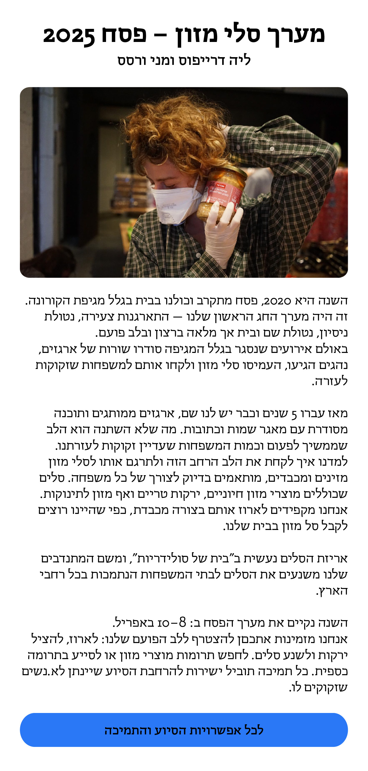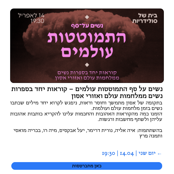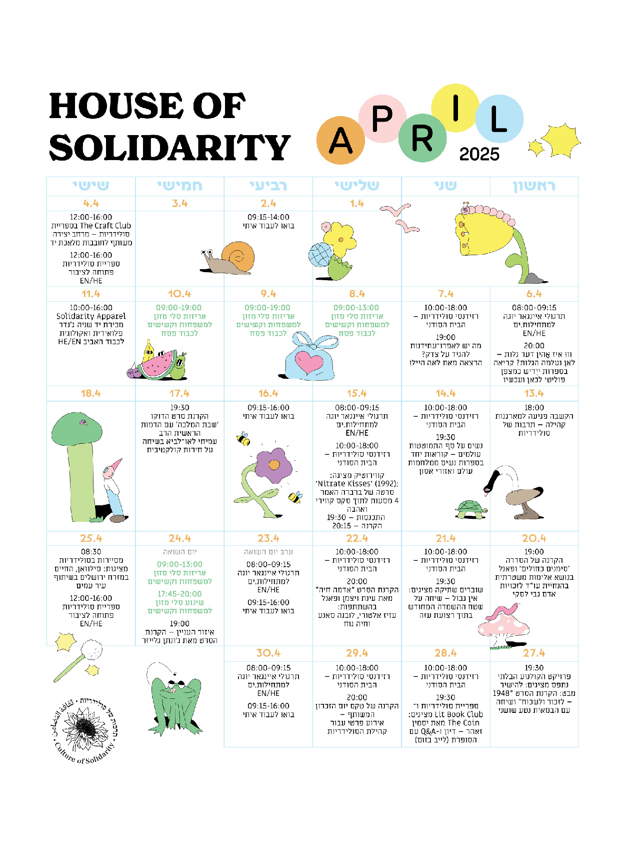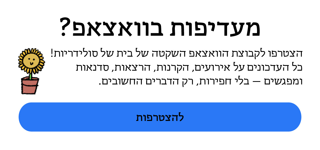 תרבות של סולידריות היא התארגנות של עזרה הדדית שהחלה את דרכה בתחילת משבר הקורונה, ומאז צמחה לתנועה רחבה של אנשים ונשים מכל רחבי הארץ אשר מקדמת עשייה של עזרה הדדית וערבות קהילתית. אנחנו מאמינות בעשייה קהילתית מבוססת חלוקת משאבים שיתופית, משמע שכל חברה וחבר בקהילה יכולים לתרום מהכישורים, מיומנויות ומשאבים שלהם במסגרת יכולתם.